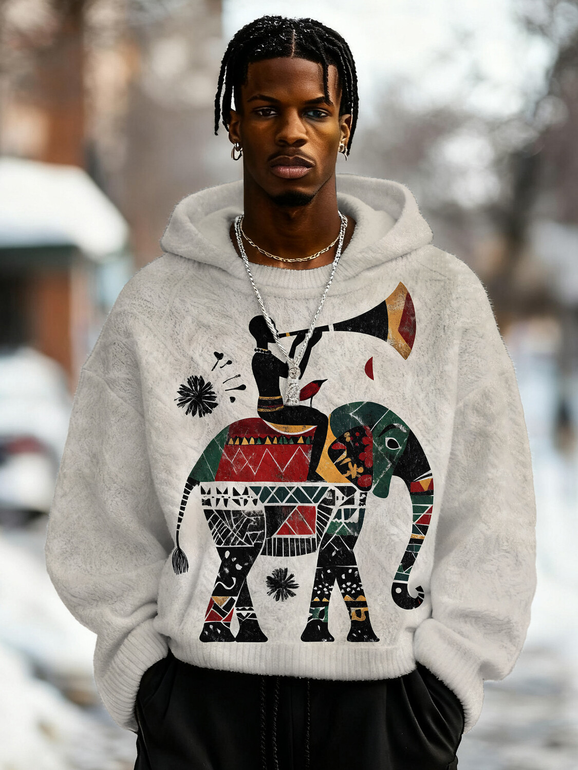 Men's Black Man Playing Music Riding Tribal Pattern African Elephant Art Print Casual Hooded Knit Sweatshirt
