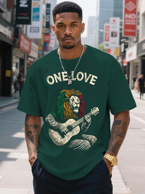 Men's ONE LOVE Reggae Lion Playing Guitar Print Cotton Casual T-Shirt