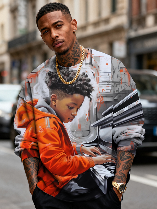 Men's Black Boy Playing Piano Art Print Casual Sweatshirt