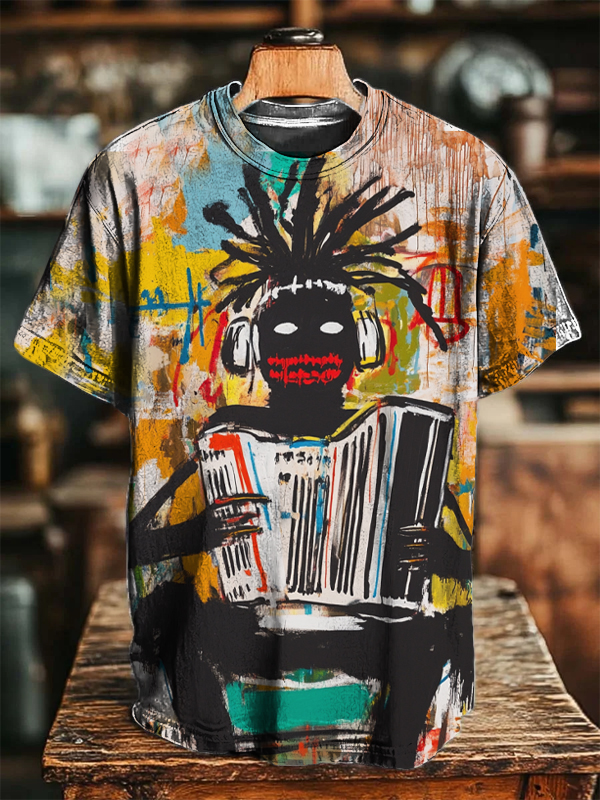 Men's Abstract Doodle Drawing Cartoon Character Playing An Accordion Print T-Shirt