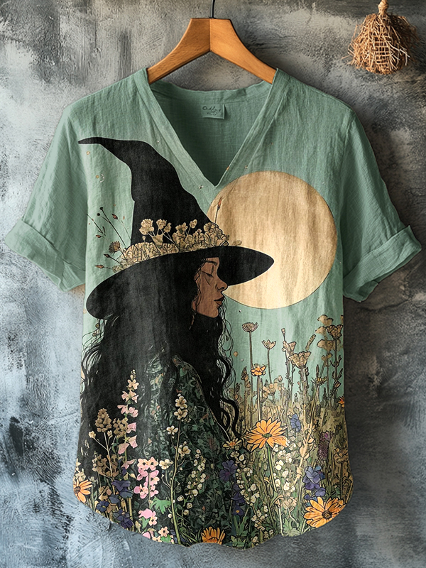 Women's Full Moon Night Witch In The Flowers Art Print V Neck T-Shirt