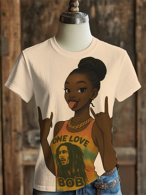 Women's Reggae Music Lover Girl One Love Bob Art Print Casual T-Shirt