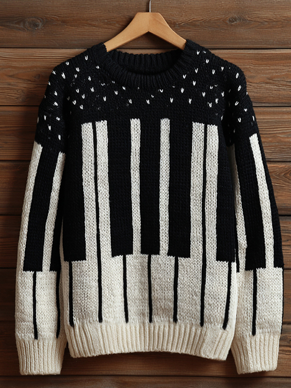 Men's Black And White Piano Keys Print Knit Sweatshirt
