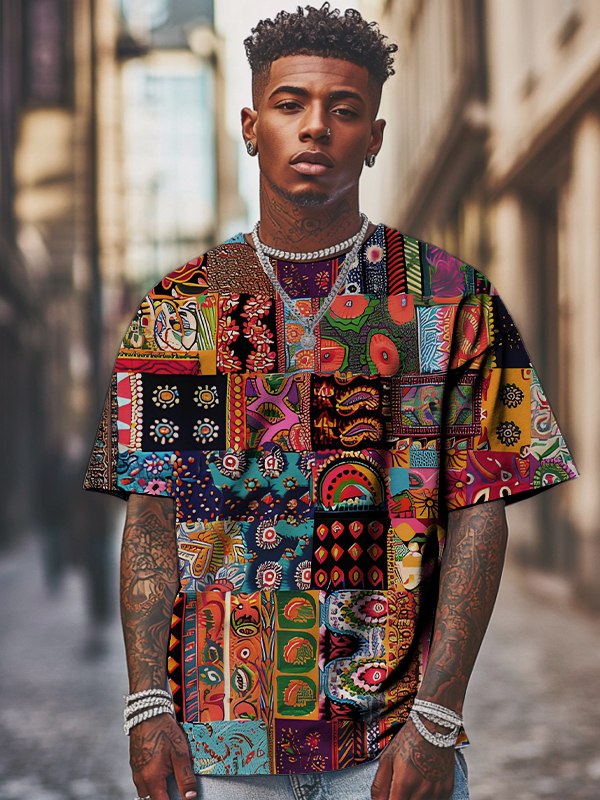 Men's Black Ethnic Pattern Retro Flower Patchwork Print Casual T-Shirt
