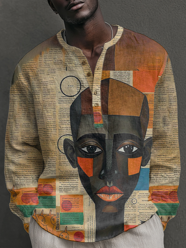 Men's Black Geometric Art Text Abstract Painting Print Long Sleeve Shirt