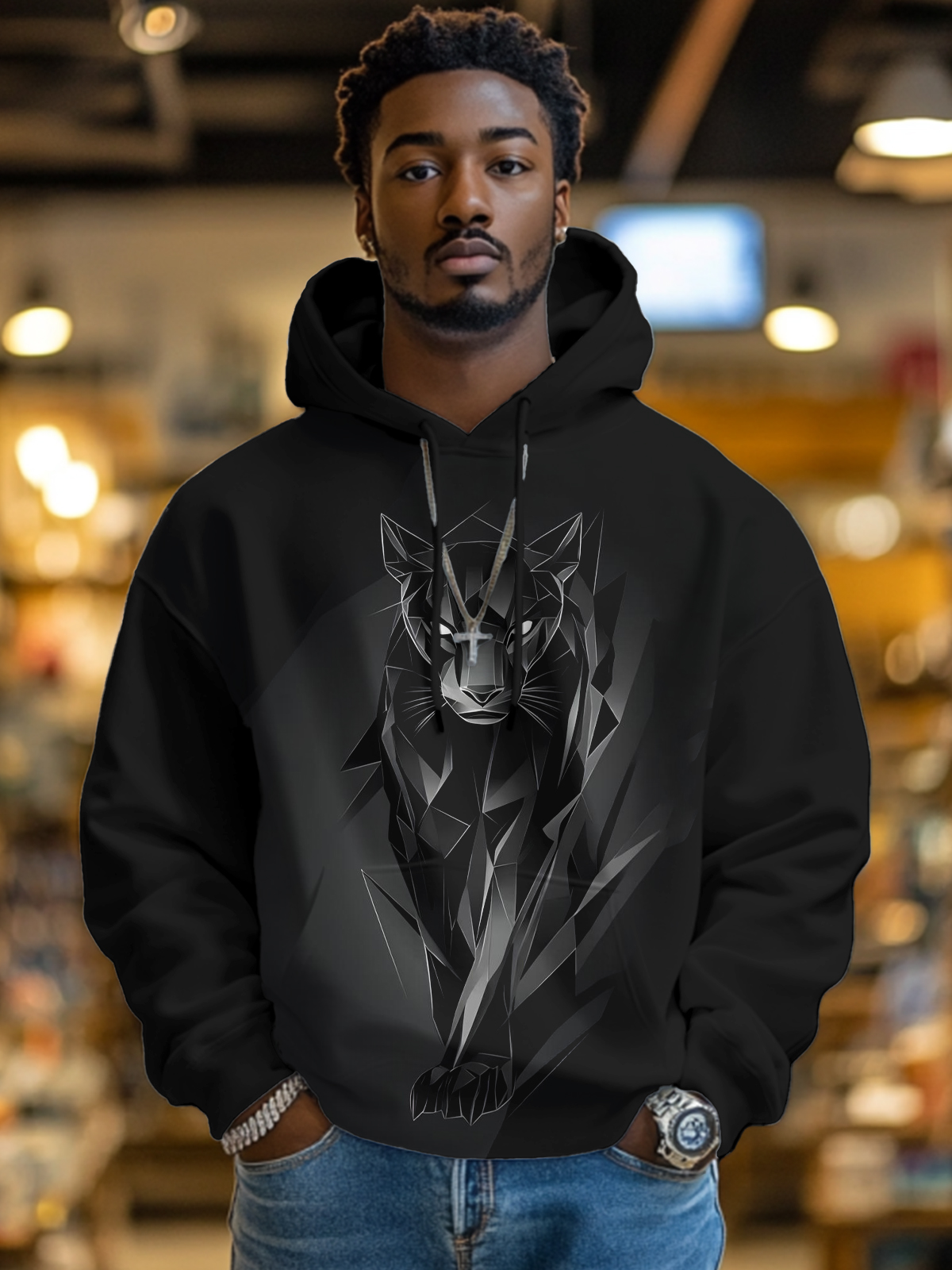 Men's Cool And Handsome Black Panther Geometric Art Print Hooded Sweatshirt