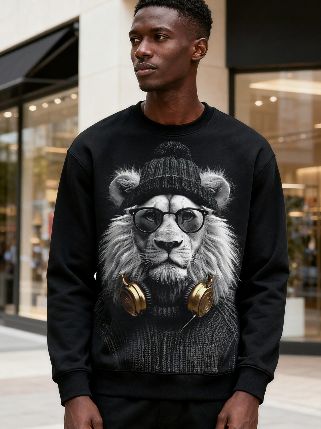 Men's Handsome Lion Wearing A Sweater And Headphones Art Print Casual Sweatshirt