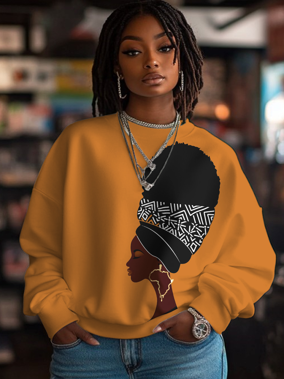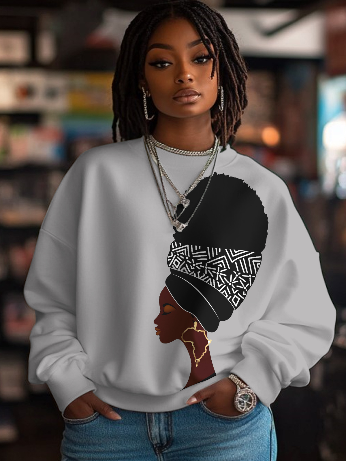 Women's African Afro Woman Print Cotton Long Sleeve T-Shirt Thin Sweatshirt