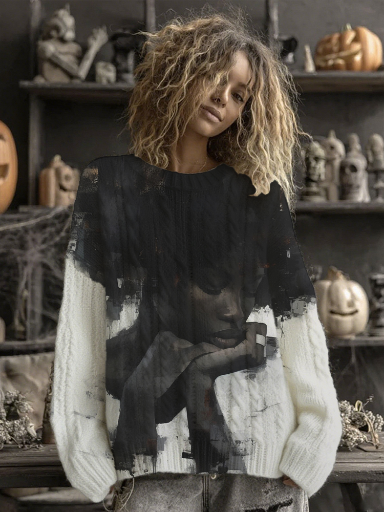 Women's Black Afro Woman Face Ink Painting Print Knit Sweatshirt